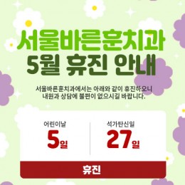 서울바른훈치과, 5월 휴진 일정 안내드려요~! 즐거운 가정의 달 보내시길 바라요 ^^   양심진료로 입소문난 서울대 치과병원, 서울바른훈치과입니다. 항상 찾아주시는 모든 분들께 감사드립니다.   저희 치과는 5월5일(금) 어린이날과 5월27일(목) 석가탄신일에 휴진하오니 내원 예약에 참고 부탁드려요. 카카오톡 상담은 휴무일 상관없이 실시간 상담 가능하며, 휴진일의 경우 네이버 예약이 불가한 점 양해 부탁드립니다.즐겁고 활기찬 가정의 달 5월, 사랑하는 분들과 함께 행복한 시간 보내시길 바랍니다.