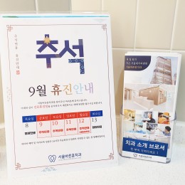 안녕하세요,  최고의 실력으로 정직하게 진료하는 서울바른훈치과입니다.항상 서울바른훈치과를 찾아주신 분들께 감사드립니다 :)  저희 치과는 9월, 추석 명절을 맞아9월 9일(금요일)~9월 12일(월요일)휴진하오니진료 예약에 참고 부탁드립니다.(대체공휴일을 제외한 목요일과 화요일은 정상진료 합니다.)  특히, 카카오 상담은 휴무일 상관없이 실시간시간 상담이 가능하오나,네이버 예약은 휴진일에는 예약이 불가한 점 양해부탁드립니다. 모두들 사랑하는 가족과 함께즐거운 명절 보내시기를 바라겠습니다 :)
