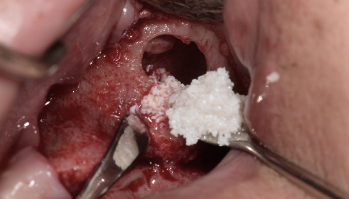 뼈 이식재를 충분히 넣어 단단하게 메꿔줍니다.